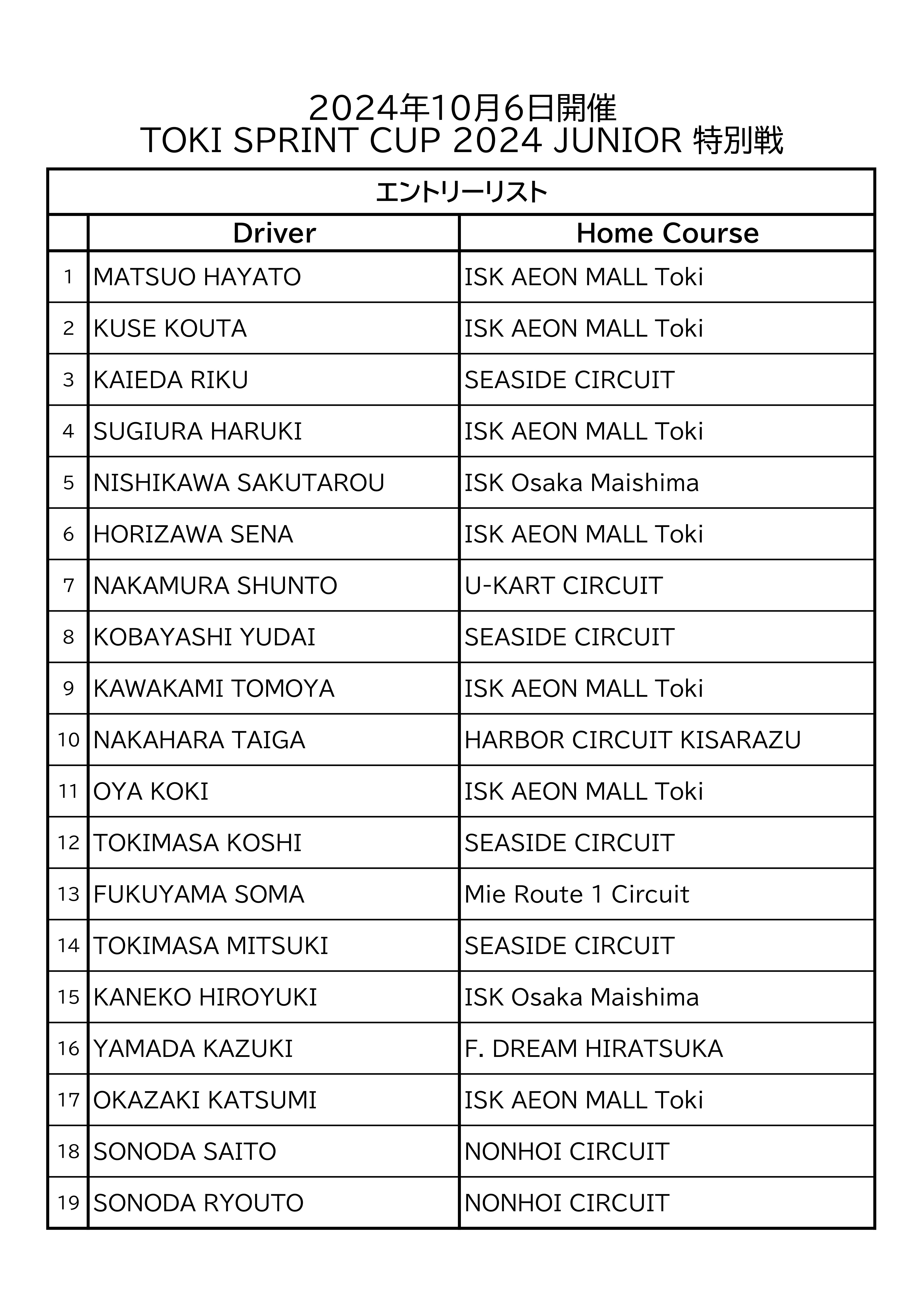 【10/6開催】TOKI SPRINT CUP 2024 JUNIOR 特別戦エントリーリスト 2024/10/05 【10/6開催】TOKI SPRINT CUP 2024 JUNIOR 特別戦のエントリーリストです。