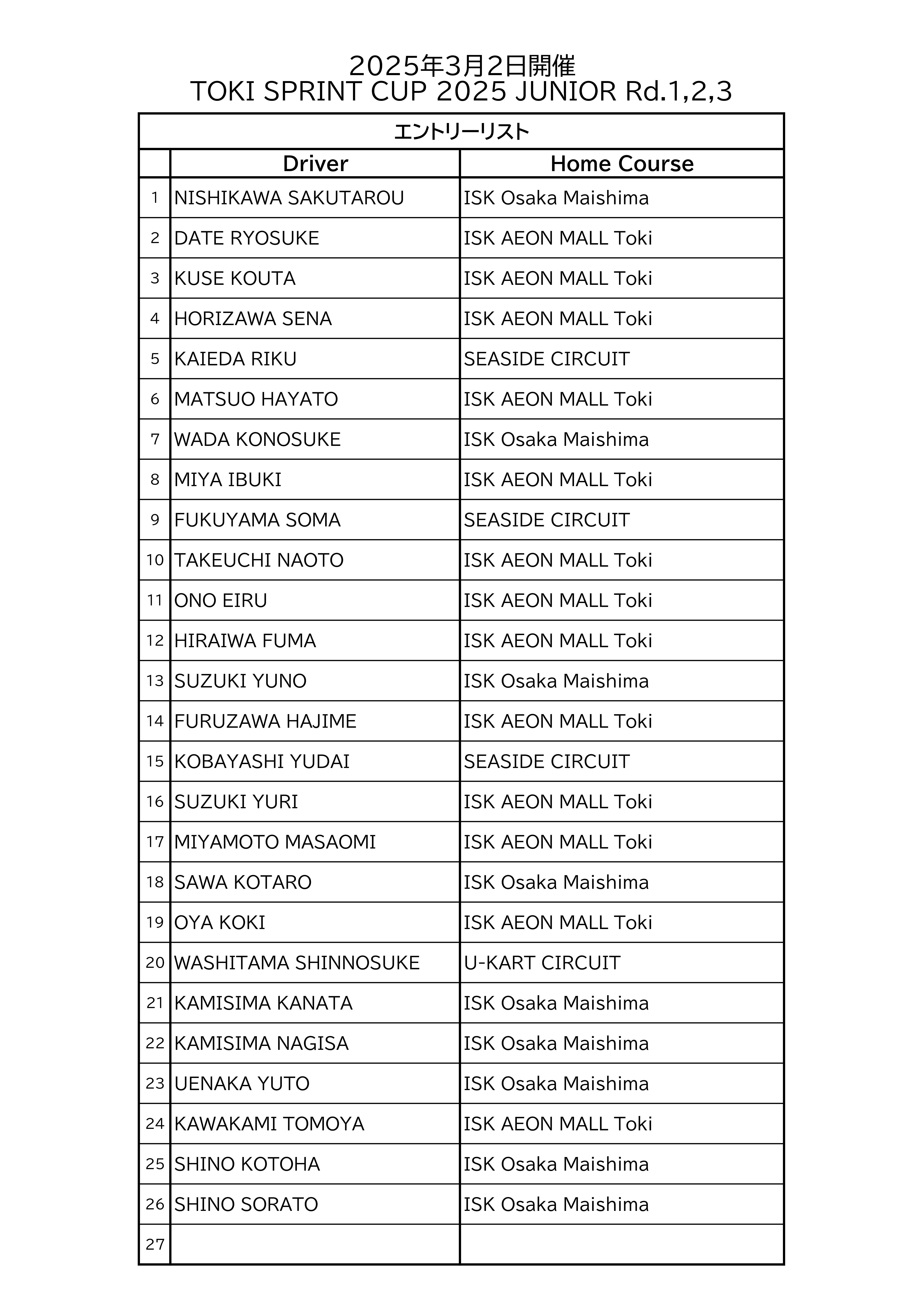 【2/20時点】TOKI SPRINT CUP 2025 JUNIOR Rd1,2,3エントリーリスト