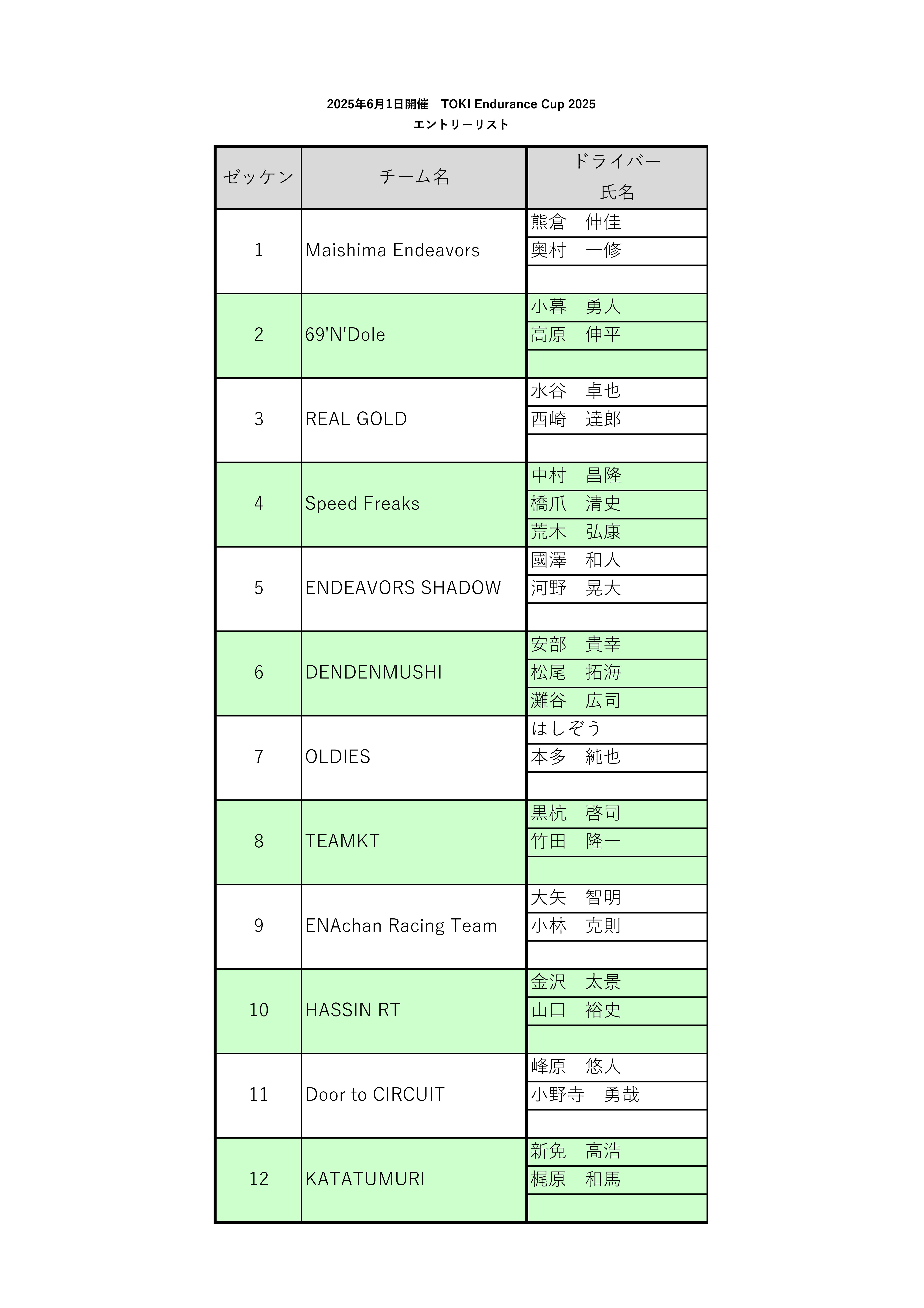6/1開催TOKI ENDURANCE CUP 2025のエントリーリストです。