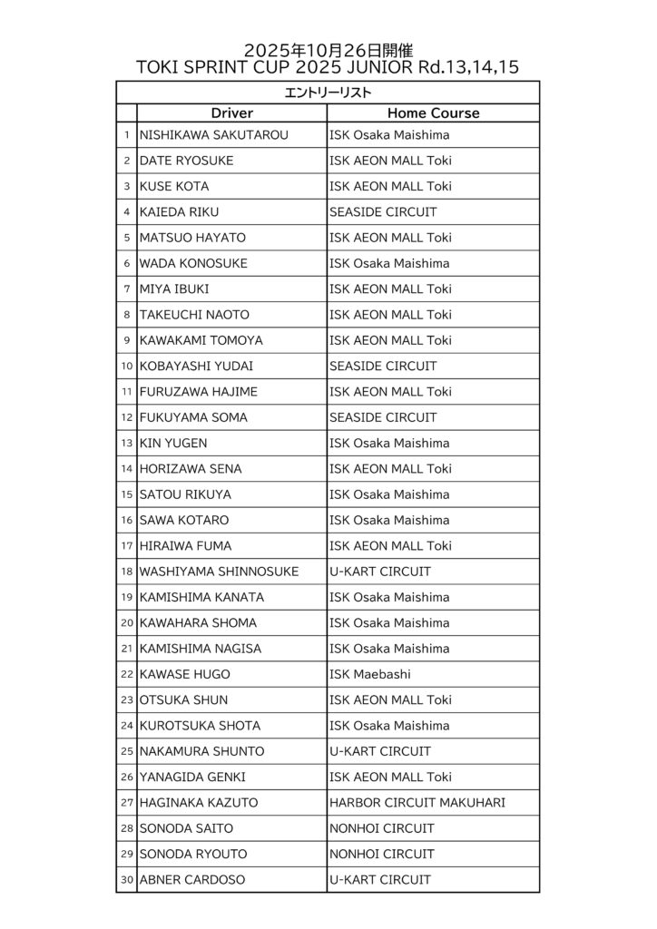 エントリーリスト及び最大エントリー数変更のお知らせ(TOKI SPRINT CUP 2025 JUNIOR Rd.13,14,15)