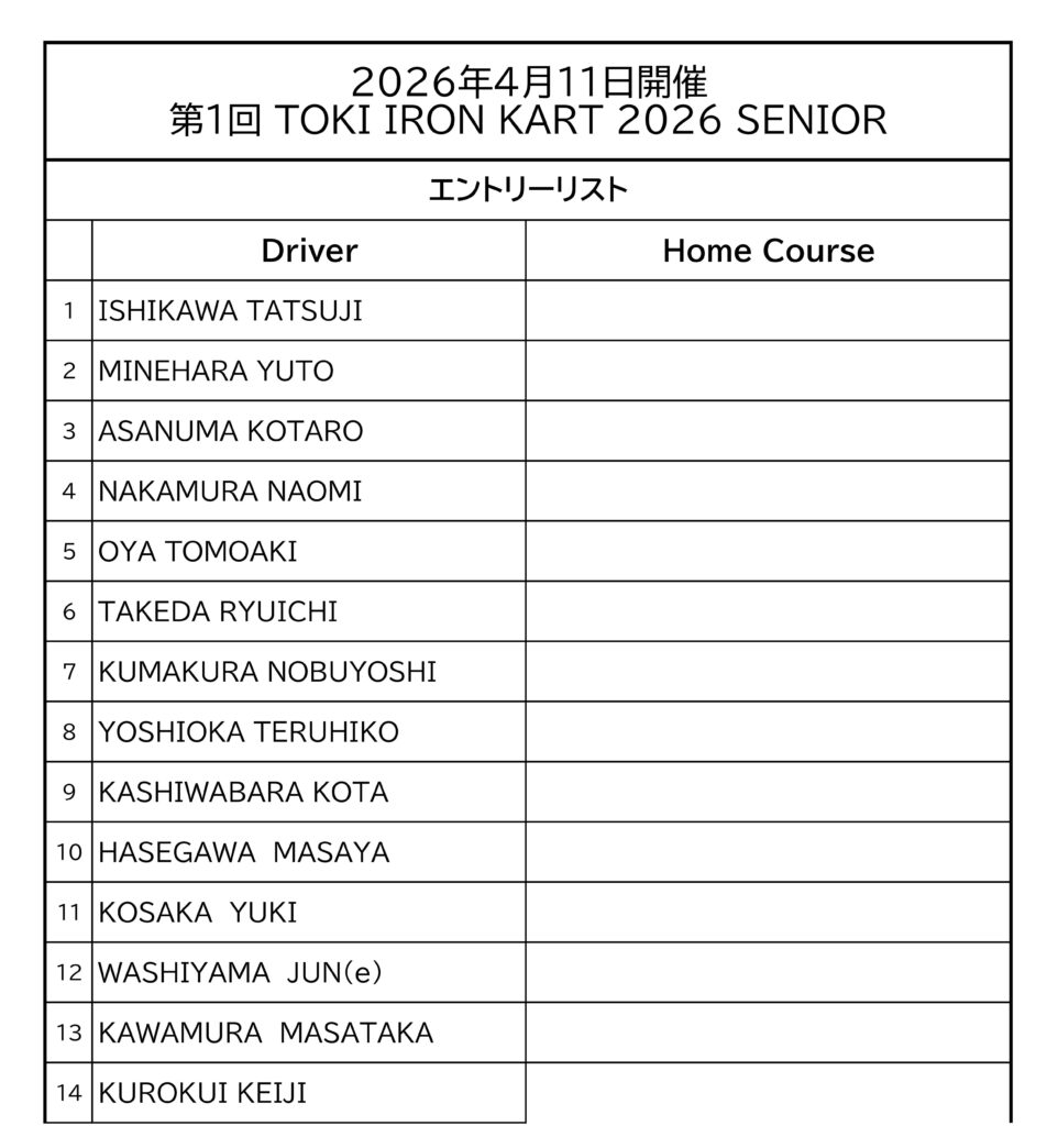 2026年4月11日開催 第1回 TOKI IRON KART 2026 SENIOR 結果
