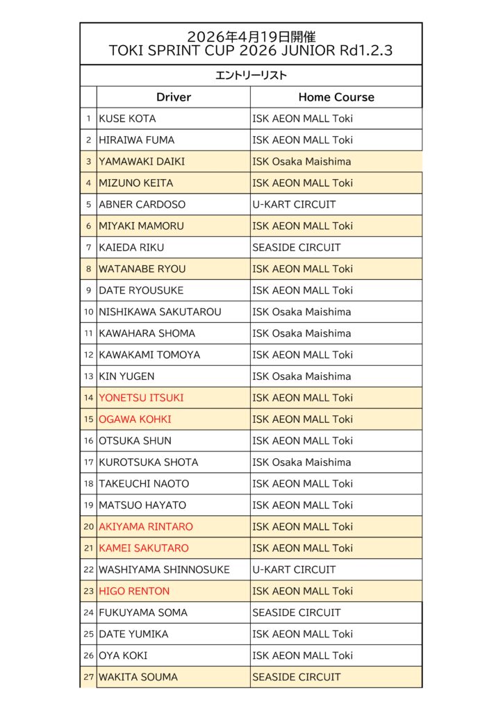 【04/19開催!TOKI Sprint Cup 2026 JUNIOR Rd1~3結果】