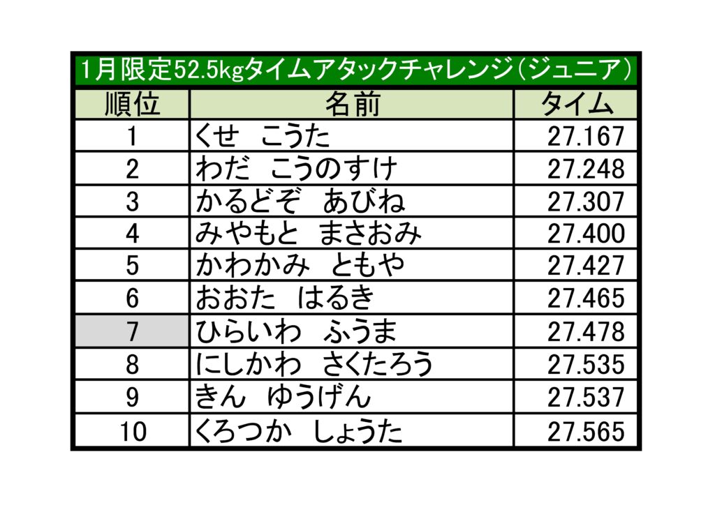 ジュニア52.5kgクラスの1位は くせこうた 選手です。これでなんとジュニアタイムアタック三連覇となります。おめでとうございます!!!
