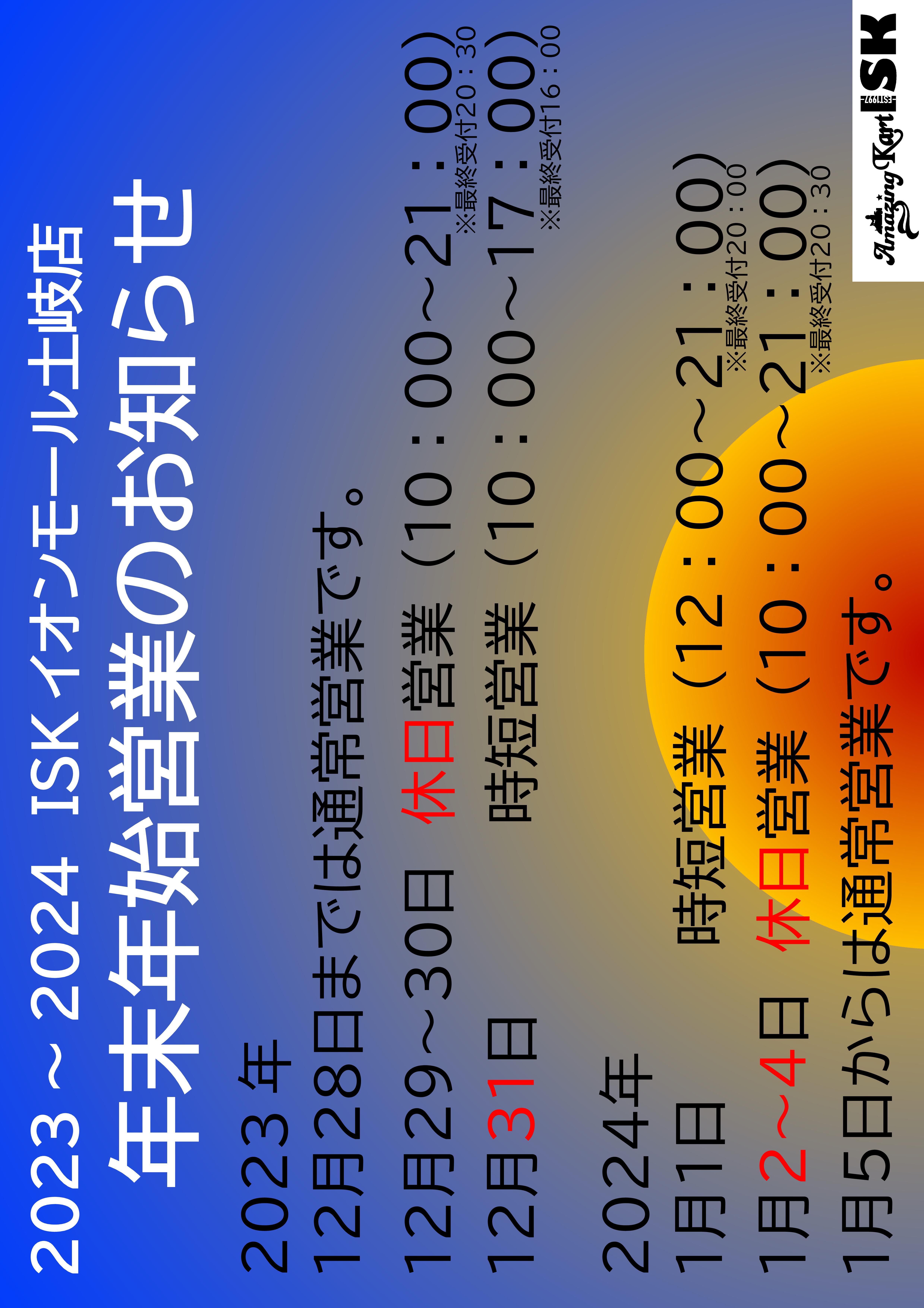 ISKイオンモール土岐店2度目の年末年始となる2023年→2024年の年末年始営業は以下の通りとなります。