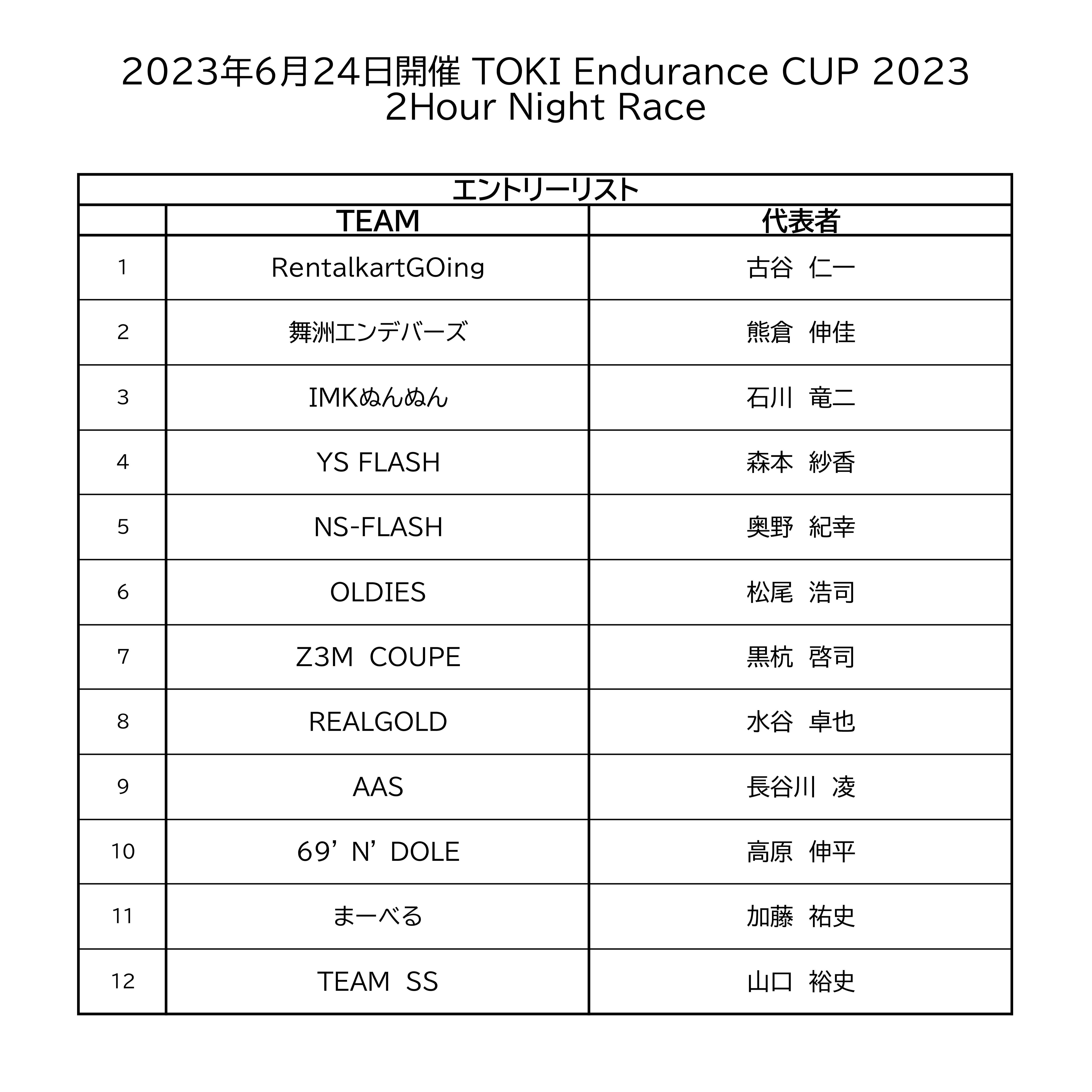 2023年6月24日開催のTOKI Endurance Cup 2023:2Hour Night Raceですが、6月1日時点でフルエントリーとなりましたので、エントリーリストを公開します。