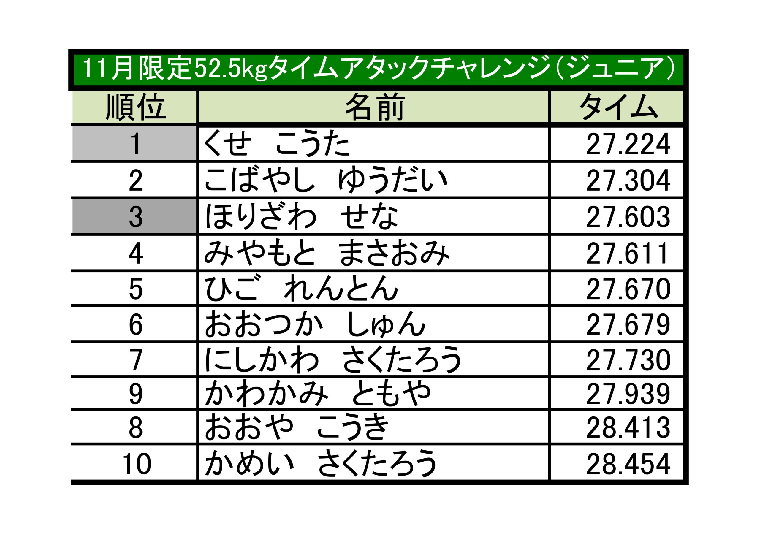ジュニア52.5kgクラスの1位は くせこうた 選手です。こちらはジャスト0.08秒差という僅差で見事1位となりました。おめでとうございます!!!