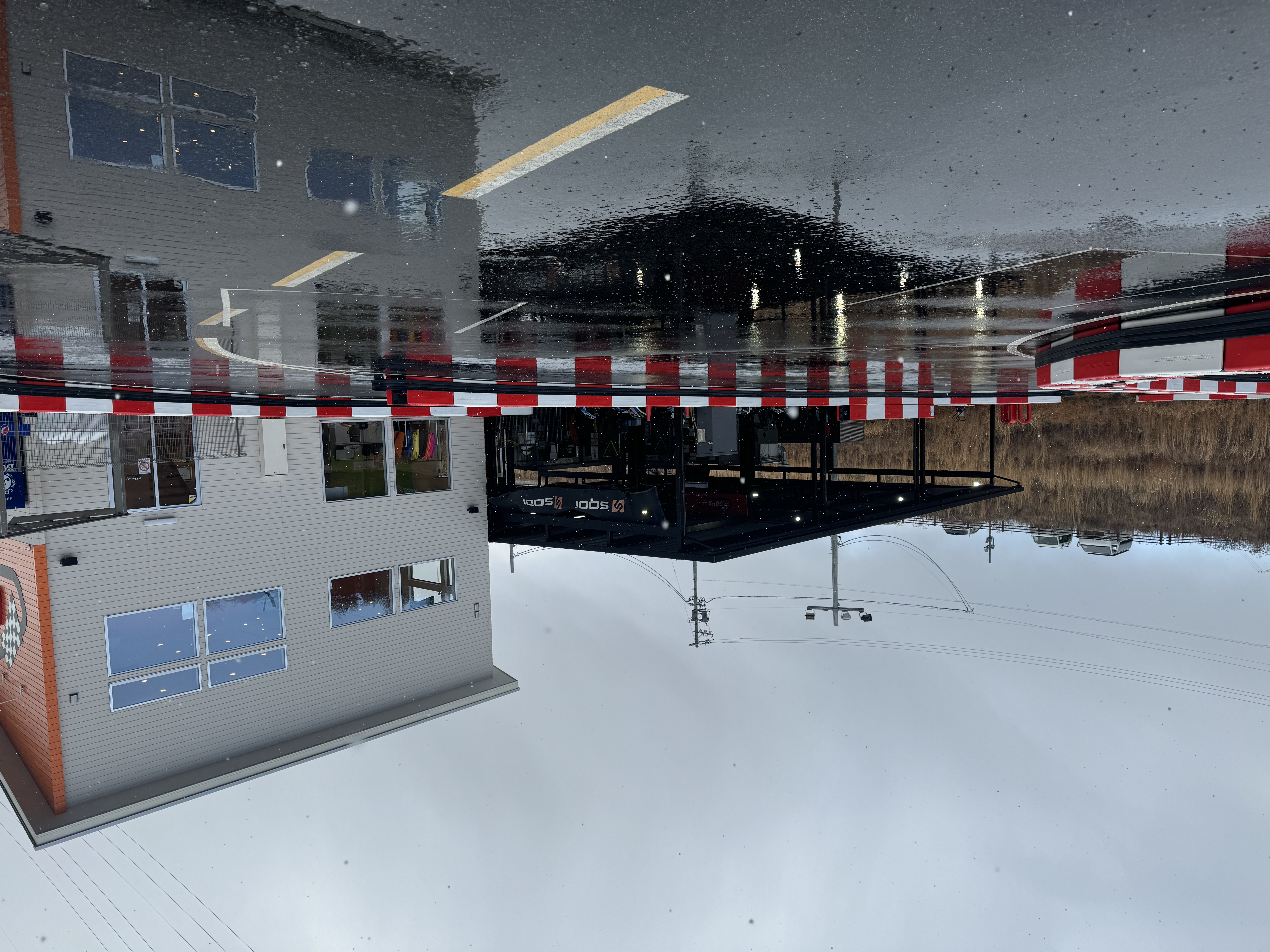 おはようございます。明朝からの雪のため、ピットアウトロードと最終Cアウト側に雪が積もっています。